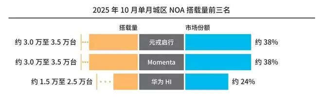 根据《中国智能驾驶行业趋势白皮书(2025)》显示,2025年10月单月,城区NOA搭载量前三名为元戎启行、Momenta、华为HI,搭载量分别约为3.0万至3.5万台、3.0万至3.5万台、1.5万至2.5万台;市场份额分别占比约38%、38%、24%。