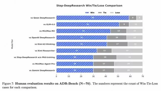 在针对真实研究场景的 adr-bench 评测中,step-deepresearch 的人类 elo 评分在多个维度处于第一梯队。