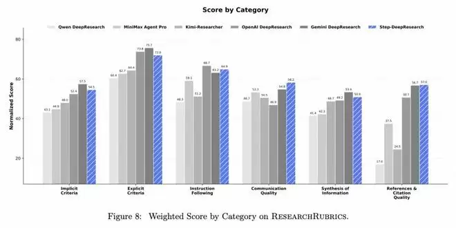 在 research rubrics 上,step-deepresearch 得分 61.42%,仅次于 gemini deepresearch(约 63.69分),且超越了 openai deepresearch。