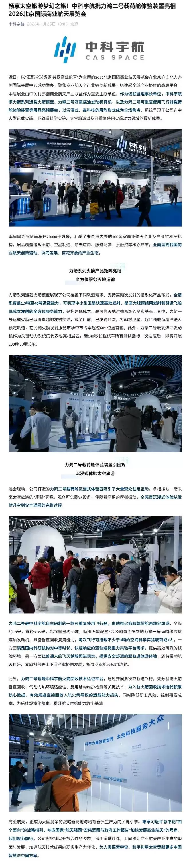 1月26日消息,近日,2026北京国际商业航天展览会在北京亦庄北人亦创国际会展中心成功举办。展会上,中科宇航研发的力鸿二号载荷舱体验装置引人注目。