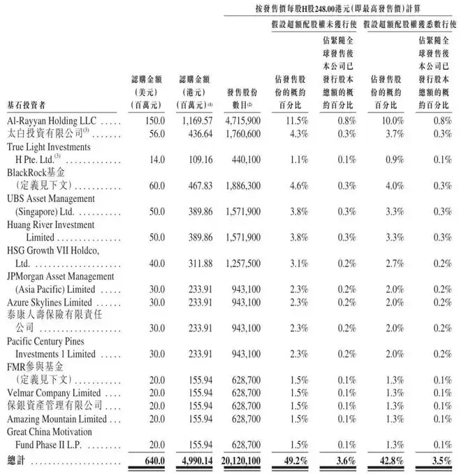 其中,Al-Rayyan认购1.5亿美元(约11.7亿港元),太白投资有限公司认购5600万美元,True Light Investments认购1400万美元,BlackRock基金认购6000万美元,UBS Asset Management、腾讯旗下Huang River Investment分别认购5000万美元,HSG Growth VII Holdco认购4000万美元;