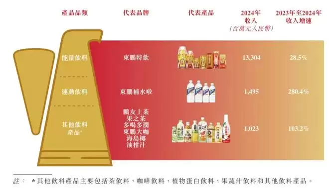 截至目前,东鹏饮料的产品矩阵已涵盖能量饮料、运动饮料、茶饮料、咖啡饮料、植物蛋白饮料和果蔬汁饮料等多个品类。