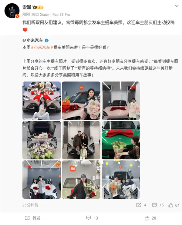 近日,小米汽车官方微博持续更新车主提车后的喜悦瞬间,一张张洋溢着幸福与满足的提车照片,吸引了诸多网友的目光。这一暖心举措源于创始人雷军采纳了用户建议,官方宣布每周定期分享车主的提车精彩瞬间,并欢迎车主们踊跃投稿,旨在进一步拉近品牌与用户的情感距离。