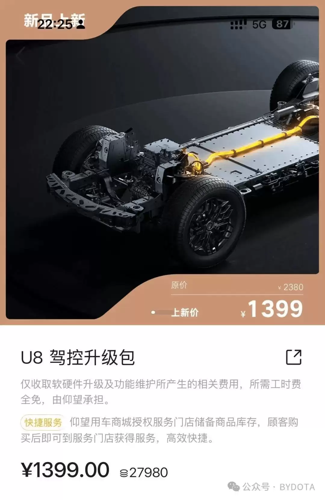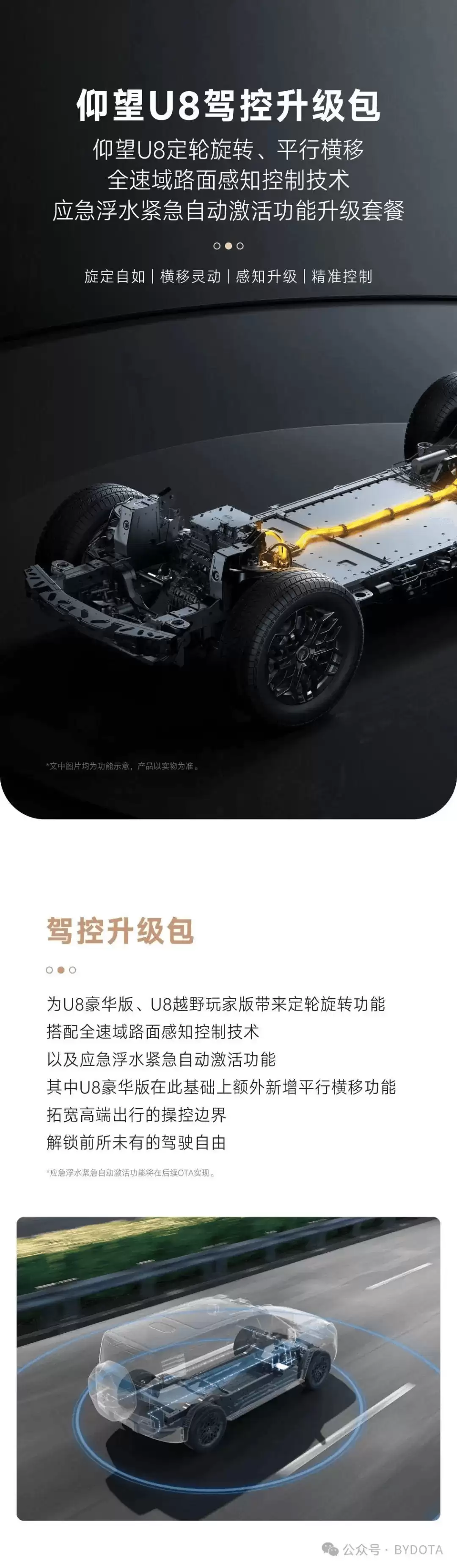 比亚迪近日宣布,针对旗下仰望U8豪华版与越野玩家版车型,推出了一项硬件升级服务。此次升级套餐定价为1399元,重点提升四项核心驾控功能,旨在为车主带来更智能、更安全的驾驶体验。