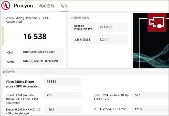 ▲我们先做了个H.264和H.265视频导出效率的测试——UL Procyon视频编辑,得分为16538。作为对比,大部分按摩店家集显本的得分在7000分以内,而上一代酷睿Ultra 225H处理器搭载Arc 130T集显+双通道32GB LPDDR5x 8533内存,成绩为11126分。相较之下,Ultra X9 388H的导出效率提升了近50%。