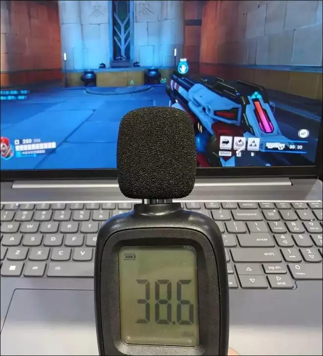 事实上,小新Pro 16 GT 2026的噪音水平可说是“低到离谱”(室温20℃):我们进行夜间游戏实测,安静封闭室内,环境噪音34dBA,我关闭音量玩《守望先锋》,一局5分钟的游戏,大部分时候风扇噪音低到玩游戏的我几乎听不见!!!