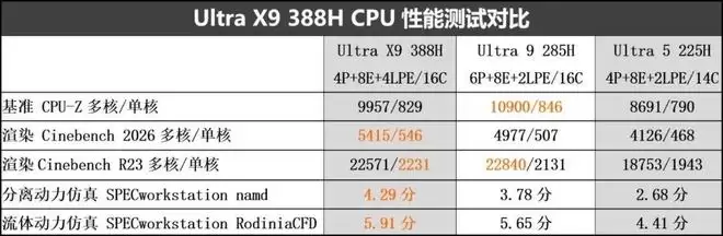 当然,Ultra X9 388H应用形态革命虽主要是靠超强的Arc B390集显(iGPU)达成的,但也必须依托于“强劲的CPU性能”。那388H的CPU性能如何呢?来看看对比▼