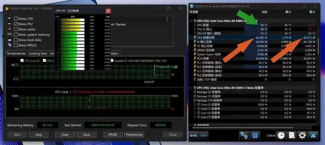 ▲室温20℃,Ultra X9 388H单考测试截图,爆发功率84W维持35秒,而后缓降至65W保持稳定。老鸟可能会问:咋只考机5分钟呢?这是因为其内部温度(90℃)已稳定,不再提升了。实际上,它在跑了3分钟的65W后,温度还降了1℃(从91℃降到了90℃)——这也是老牛我第一次遇到在稳定功率考机时温度下降的机器。