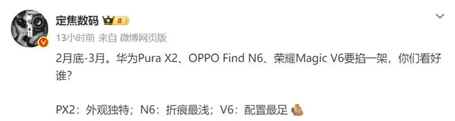 而在折叠屏市场在沉寂了半年后,终于要在2月底到3月初迎来一场血雨腥风,其中就包括华为Pura X2、OPPO Find N6、荣耀Magic V6。