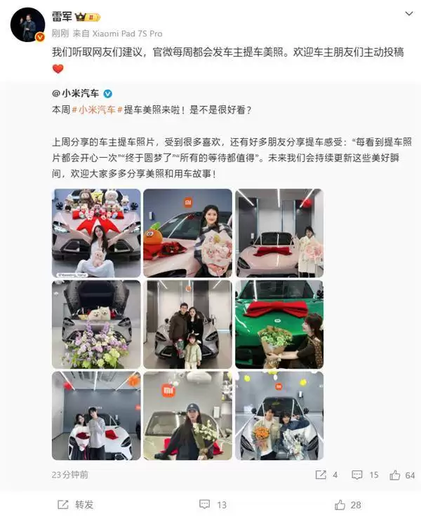 最近,小米汽车在其官方微博发起了一项有趣的活动——每周分享车主的提车靓照,这个创意点子其实来自网友们的建议。创始人雷军在社交媒体上热情邀请车主朋友们踊跃投稿,和大家一起分享提车时的喜悦。