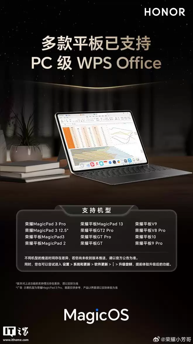 参考此前报道,目前已支持PC级WPS Office的荣耀平板如下: