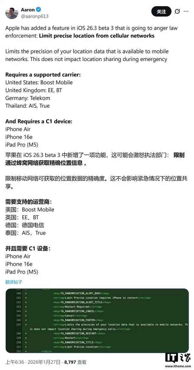 据IT之家1月27日报道,苹果公司于26日更新其官方支持文档,详细介绍了即将在iOS 26.3系统中推出的“限制蜂窝网络获取精确位置”新功能。