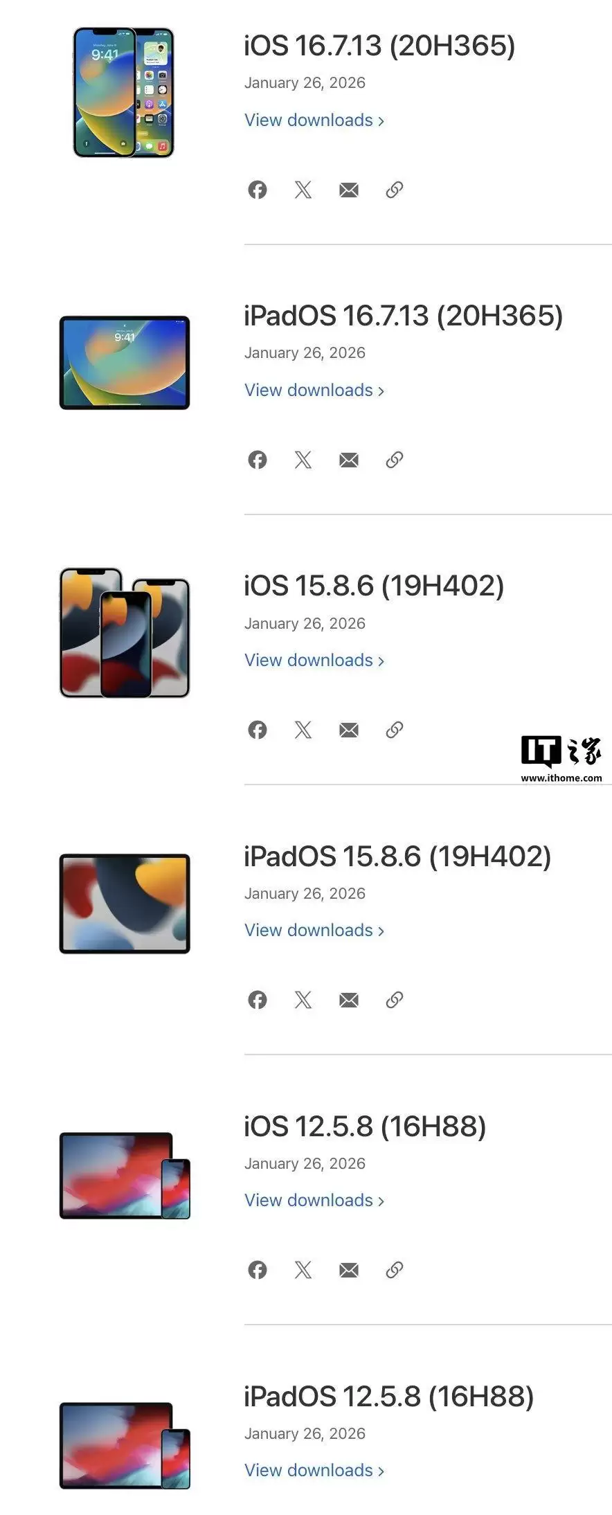 iOS 18.7.4 (22H218) iOS 16.7.13 (20H365) iOS 15.8.6 (19H402) iOS 12.5.8 (16H88) iPadOS 18.7.4 (22H218) iPadOS 16.7.13 (20H365) iPadOS 15.8.6 (19H402) iPadOS 12.5.8 (16H88)