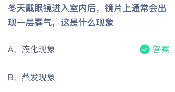 冬天戴着眼镜从室外进入温暖的室内后,镜片上常常会蒙上一层雾气,你知道这背后是什么原理吗?支付宝上的蚂蚁庄园小课堂今天又开课啦!每天只需花一分钟答题,就能赚取饲料喂养小鸡,既能轻松休闲,又能贡献爱心,可谓一举两得!在2026年1月27日的蚂蚁庄园小课堂问题中,正确答案就是【液化现象】。具体来说,冬天眼镜片遇热产生的雾气,正是水蒸气遇冷液化的结果。