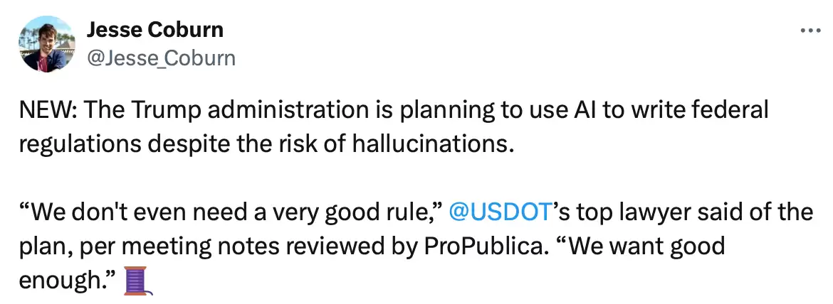 根据ProPublica获取的内部会议记录及员工访谈,该计划已于上月向部门员工透露。交通部最高法律顾问格雷戈里·泽尔赞表示,特朗普总统对此“非常兴奋”,并称该部门将成为“首个全面启用AI起草法规的机构”。他同时透露,该计划的最终目标是将法规起草与审核时间大幅压缩,AI可在20分钟内生成草案初稿。