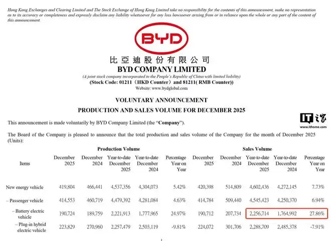 根据比亚迪最新公布的数据,2025年其纯电动汽车累计交付量达225.67万辆,相比2024年(176.50万辆)实现27.86%的同比增长。IT之家附相关截图如下: