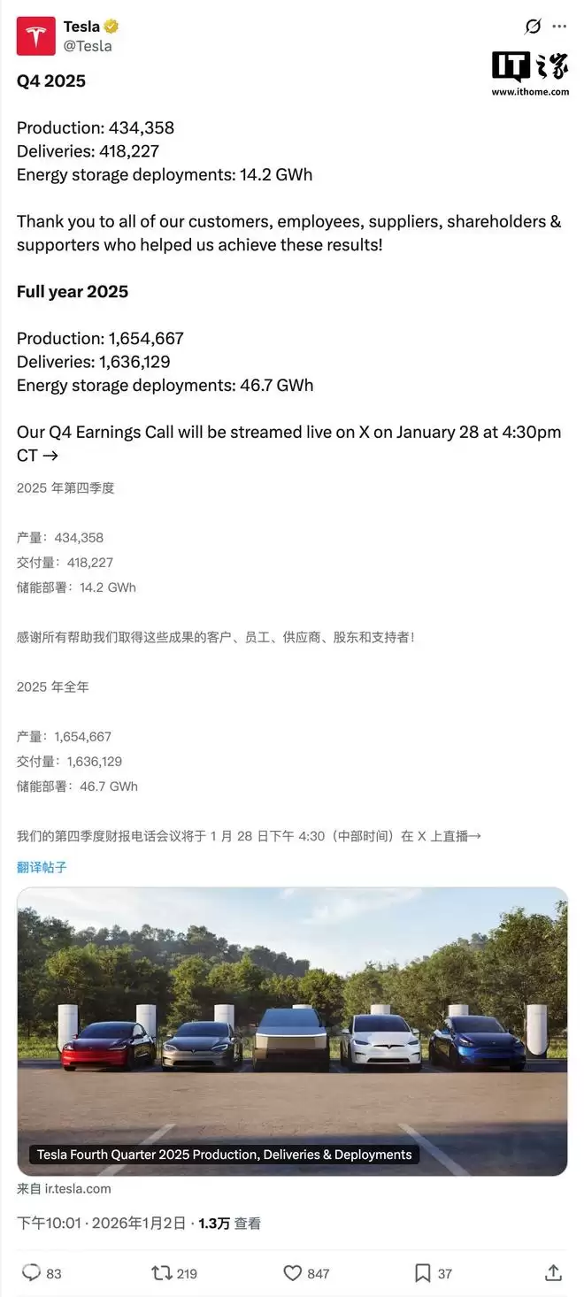 特斯拉2025年全年产量为165.47万辆,交付量为163.61万辆,储能部署规模达46.7吉瓦时。