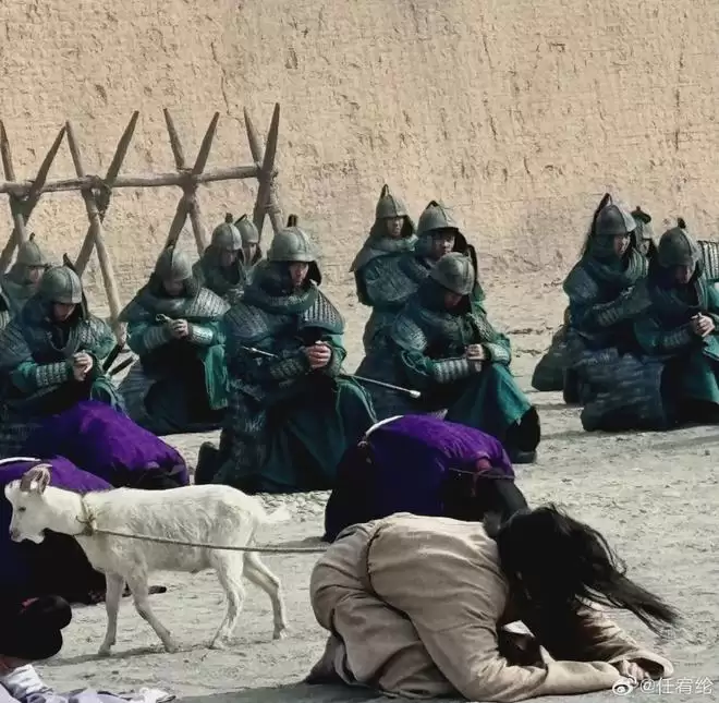 剧集用8K镜头拍出来的效果是真的震撼,黄昏逆光下,任宥纶饰演的石重贵光着脚,只着一件单薄的麻布袍子,腰上勒着粗绳,和活羊捆在一起在郊野匍匐跪行。