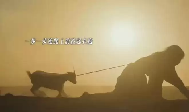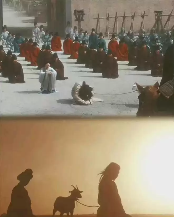镜头特意给了绳索勒紧袍子的特写,还有石重贵每爬一步,身边的羊就跟着趔趄的画面,没有嘶吼台词,也没有激烈冲突,却凭着这种沉静又窒息的镜头语言,把帝王尊严甚至是人的尊严被碾得粉碎的感觉传递得淋漓尽致。
