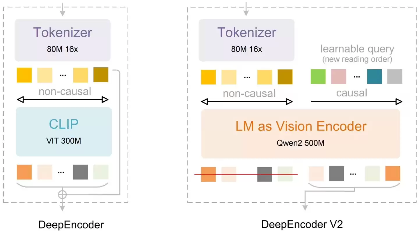 DeepSeek-OCR 2的改进重点在于引入“视觉因果流”概念。团队用类语言模型结构替代了原先基于CLIP的视觉编码模块,并在编码器内部引入可学习的“因果流查询标记”。