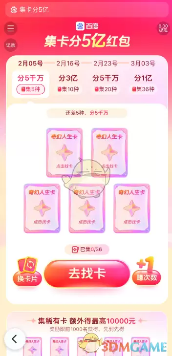 你也可以先进入百度,搜索“春节红包”进入相关活动页面,在【点我涨现金】按钮的右侧,就能看到【集卡分5亿】的活动入口,点击它同样能快速加入2026年百度春节集卡活动!