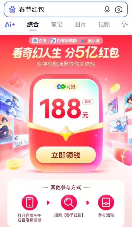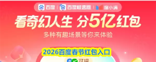 2026年百度APP春节红包活动已开始。用户可搜索“春节红包”参与:体验“奇幻人生”AI互动并集卡,前1000名集齐5张稀有卡可赢最高万元现金;每晚20点还可通过文心助手猜口令抢隐