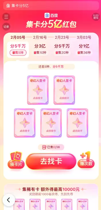 2026百度春节集卡活动现已上线。用户可在百度APP内直接搜索“集卡分五亿”或“百度集卡”,从结果页点击“立即参与”进入活动主页面。此外,在“春节红包”活动内找到“集卡分5亿”入口