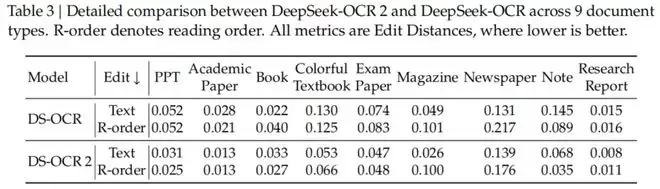 特别值得一提的是,在阅读顺序(R-order)的编辑距离(Edit Distance)指标上,DeepSeek-OCR2从前代的0.085显著降低到了0.057。