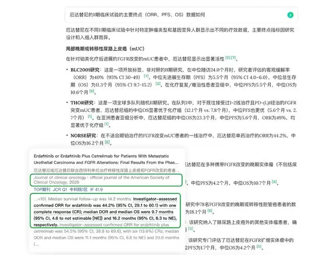 例如,当用户在氢离子搜索“厄达替尼的II期临床试验的主要终点数据如何”时,系统不仅给出结构化的医学结论与分析,还会在每项结论旁标注引用标签,点击标签即可查看该结论引用的原始文献及支撑的具体语句。用户可以实现从结论到证据的无缝追溯,确保每一处引用均可验、可信。