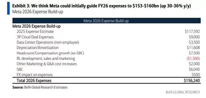 数据令人咋舌。美银预测 Meta 2026 年的总费用将激增至1530亿—1600亿美元,同比增幅高达30-36%。更夸张的是资本开支(Capex),预计将达到1090亿-1140亿美元。这种疯狂的投入主要源于基础设施建设,包括与核能公司的电力交易以及新成立的“Meta Compute”团队。