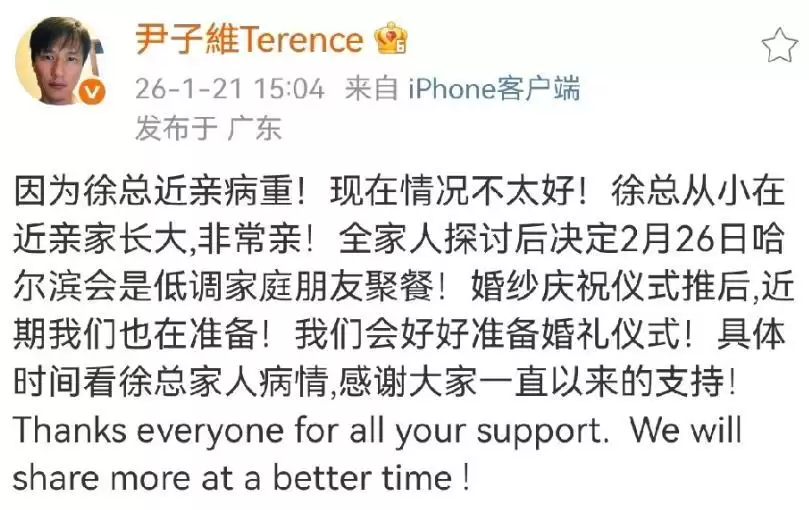 一月二十一日,尹子维在自己的微博上,发布了一条婚礼推迟的声明。