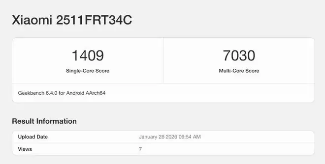 另外,型号为 2511FRT34C 的小米旗下手机现身了 GeekBench 跑分。