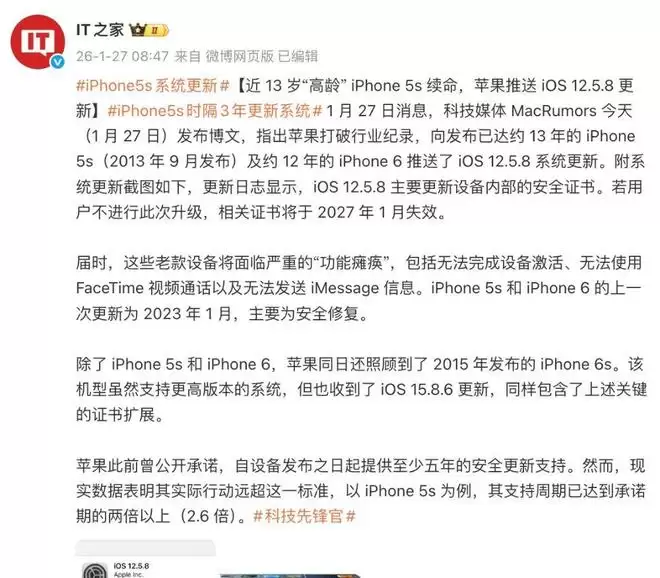 更新日志显示,iOS 12.5.8 主要更新设备内部的安全证书。若用户不进行此次升级,相关证书将于 2027 年 1 月失效。