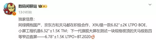 根据另一位博主的爆料,代号X9U的Ultra机型将配备一块6.82英寸的2K分辨率LTPO柔性屏,供应商为京东方。