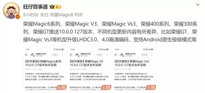 但荣耀最近这波操作有点反常态,比如在1月27日,荣耀一口气给Magic6系列、Magic V3/Vs3折叠屏,甚至荣耀GT、400/300这些中端线,全量推送了MagicOS 10.0.0.127版本。