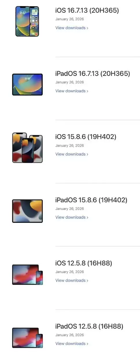 而且苹果同步推送了横跨iOS 12、15、18、26四个大版本的更新,完成了一次从上古神器到未来旗舰的全景式维护。