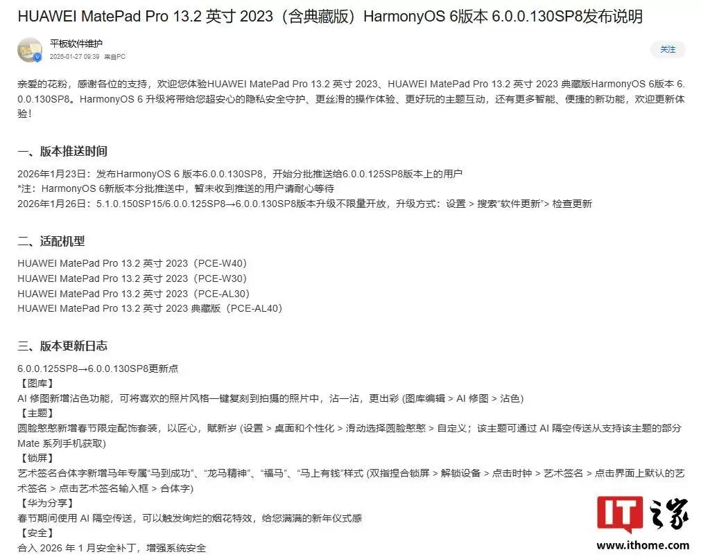 1月27日,据华为方面最新消息,其平板软件维护团队透露,包括MatePad 11.5"S、MatePad Pro 13.2英寸、MatePad Air及MatePad Mini在内的多款平板现已不限量开放HarmonyOS 6.0.0.130版本升级。本次更新为用户带来了全新的AI染色功能。
