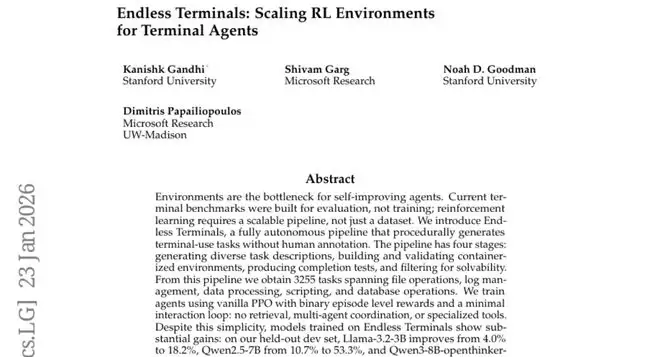 这项研究解决了一个困扰AI领域已久的难题:如何让AI系统学会在终端环境中执行复杂任务,比如处理文件、分析日志、操作数据库等工作。这些技能对于现代软件开发、系统管理和数据分析至关重要,但传统的训练方法要么需要大量人工标注数据,要么依赖昂贵的专有模型。研究团队开发了一个名为"Endless Terminals"的系统,就像一个永不停歇的任务工厂,能够自动生成数千个不同难度的终端任务,让AI在解决这些问题的过程中不断提升能力。