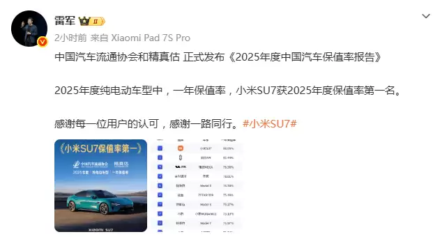 2025汽车保值榜:小米SU7纯电夺冠,雷军致谢用户