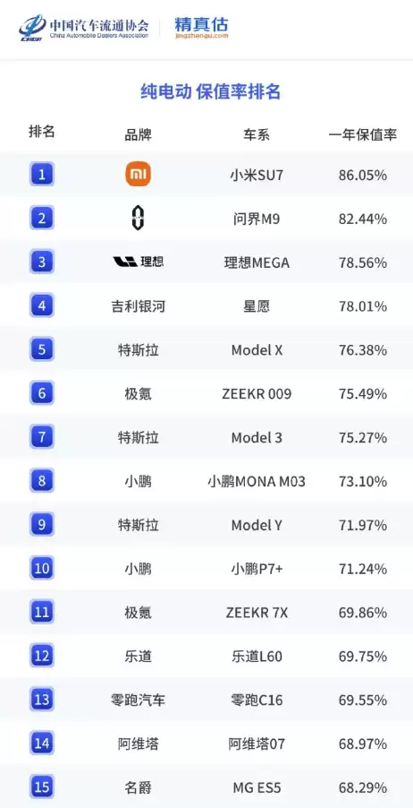 中国汽车流通协会联合精真估最新发布的《2025年度中国汽车保值率报告》显示,在纯电动车型一年保值率榜单中,小米SU7凭借显著优势登顶榜首,问界M9与理想MEGA分列第二、第三位。