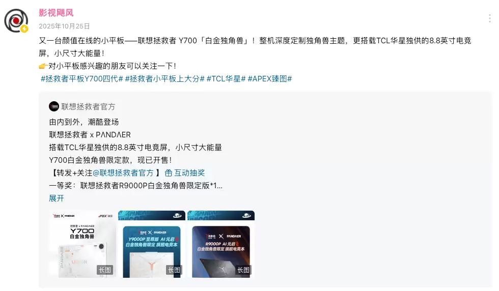 联想拯救者平板Y700四代自上市以来,凭借出色的游戏操控与卓越的画质体验,迅速在玩家群体中成为热门话题。知名科技内容创作者“影视飓风”更是盛赞其拥有“小尺寸大能量”的越级表现。