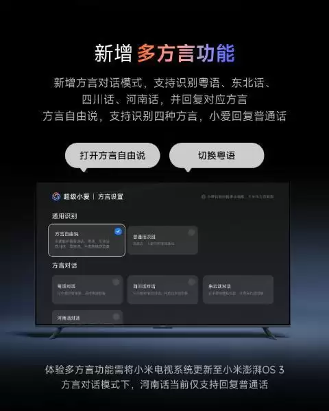 小米电视小爱更新:支持粤语河南话等多方言交互