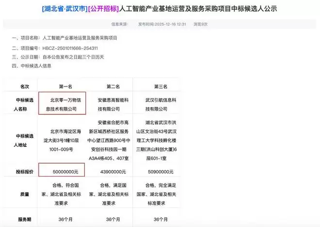 早前在2025年12月16日,该项目已发布了中标候选人公示,北京零一万物信息技术有限公司位列第一中标候选人。