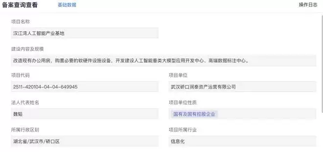 2025年11月22日,武汉硚口润泰资产运营有限公司的《汉江湾人工智能产业基地》项目获得备案,项目总投资达7500万元,拟开工时间为2025年12月。