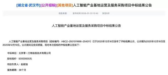 智东西1月26日报道,1月23日,“武汉人工智能产业基地运营及服务采购项目”公布了中标结果,北京零一万物信息技术有限公司最终中标,投标报价为5000万元。