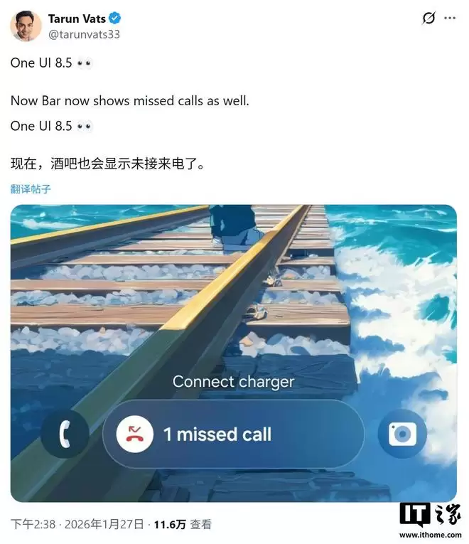 1月28日消息,据可靠消息源Tarun Vats昨日(1月27日)在社交平台爆料,三星基于安卓16深度定制的One UI 8.5测试版系统中,锁屏界面底部的Now Bar组件将新增“未接来电”通知功能。