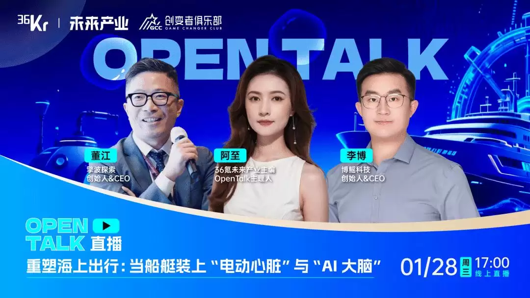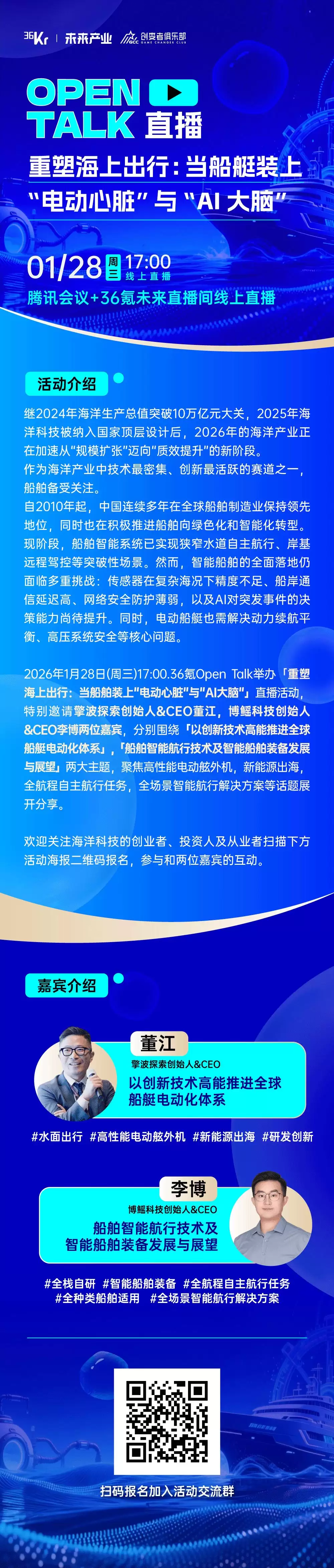 2026年1月28日(周三)17:00,OpenTalk将举办“重塑海上出行:当船舶装上 ‘电动心脏’ 与 ‘AI大脑’”线上直播活动。活动特别邀请到引擎探索创始人兼CEO董江、博鹏科技创始人兼CEO李博两位嘉宾,将分别围绕“以创新技术高效推进全球船舶电动化体系”、“船舶智能航行技术及智能船舶装备发展与展望”两大主题,聚焦高性能电动船外机、新能源出海、全航程自主航行任务、全场景智能航行解决方案等话题展开分享。