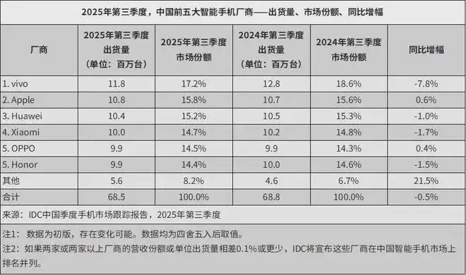 好在中国智能手机市场的竞争格局高度集中,几大头部品牌出货量差距不足 1%。IDC 今年中国前五大智能手机出货量排名中,华为与苹果的出货量差距仅为 0.2%,小米与 OPPO 的差距也不过 0.1%。