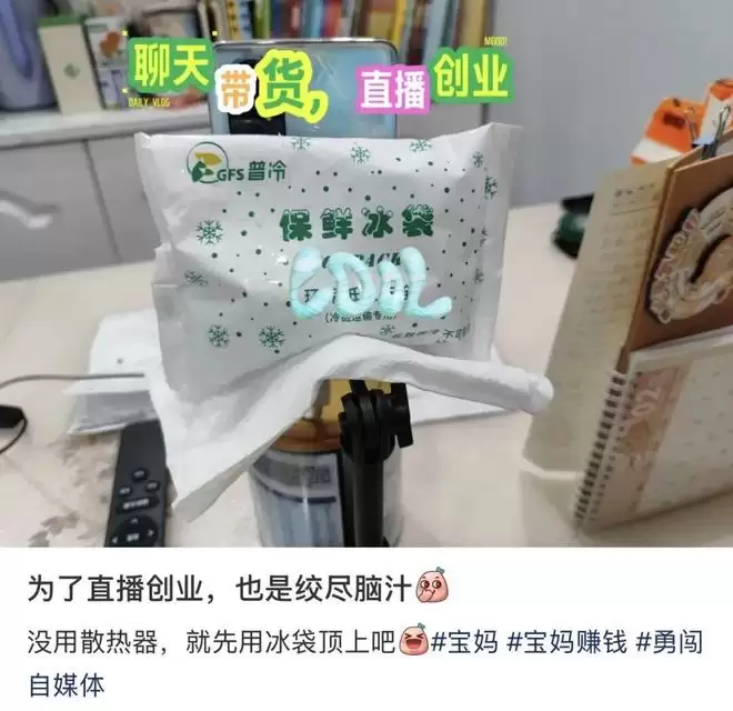 在小红书上,我搜到了各种各样关于手机直播时降温的「邪修」方式,包括把冰袋绑在手机背面或者用风冷进行物理降温。但它们要么和手机支架的安装造成相互干扰,要么会带来额外的噪音,仔细一想都是些治标不治本的办法。
