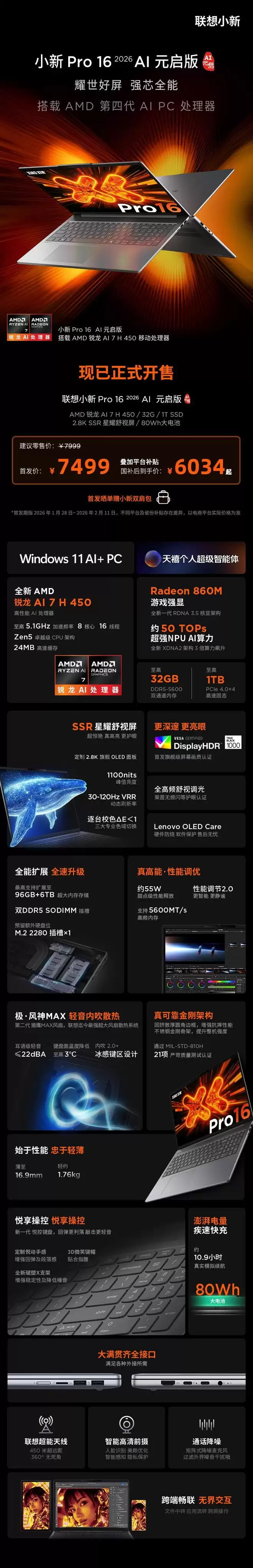 小新 Pro 14 锐龙 2026 AI 元启版:配备AMD 锐龙 AI 7 H 450 处理器、32GB 内存、1TB SSD、2.8K SSR 星耀舒视屏、60Wh 大电池,首发价7299元,叠加国补后5864元起。小新 Pro 16 锐龙 2026 AI 元启版:搭载AMD 锐龙 AI 7 H 450 处理器、32GB 内存、1TB SSD、2.8K SSR 星耀舒视屏、80Wh 大电池,首发价7499元,叠加国补后6034元起。小新 Pro 14 GT 锐龙 2026 AI 元启版:采用AMD 锐龙 AI 9 H 465 处理器、32GB 内存、1TB SSD、2.8K SSR 星耀舒视屏、92.5Wh 大电池,首发价8299元,叠加国补后6714元起。小新 Pro 16 GT 锐龙 2026 AI 元启版:升级为AMD 锐龙 AI 9 H 465 处理器、32GB 内存、1TB SSD、2.8K SSR 星耀舒视屏、99.9Wh 大电池,首发价8499元,叠加国补后6884元起。